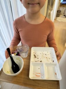 ワンプレート+お盆スタイルにしておくことで、洗い物が減るうえに、子どもがそのまま片づけられる仕組み